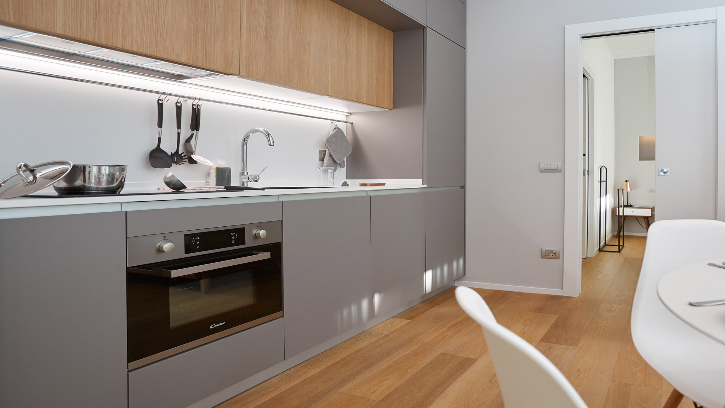 Three-room flat renovated and used as a bed&breakfast in the Milan city centre. It is defined by grey tones in all its various shades and wood.