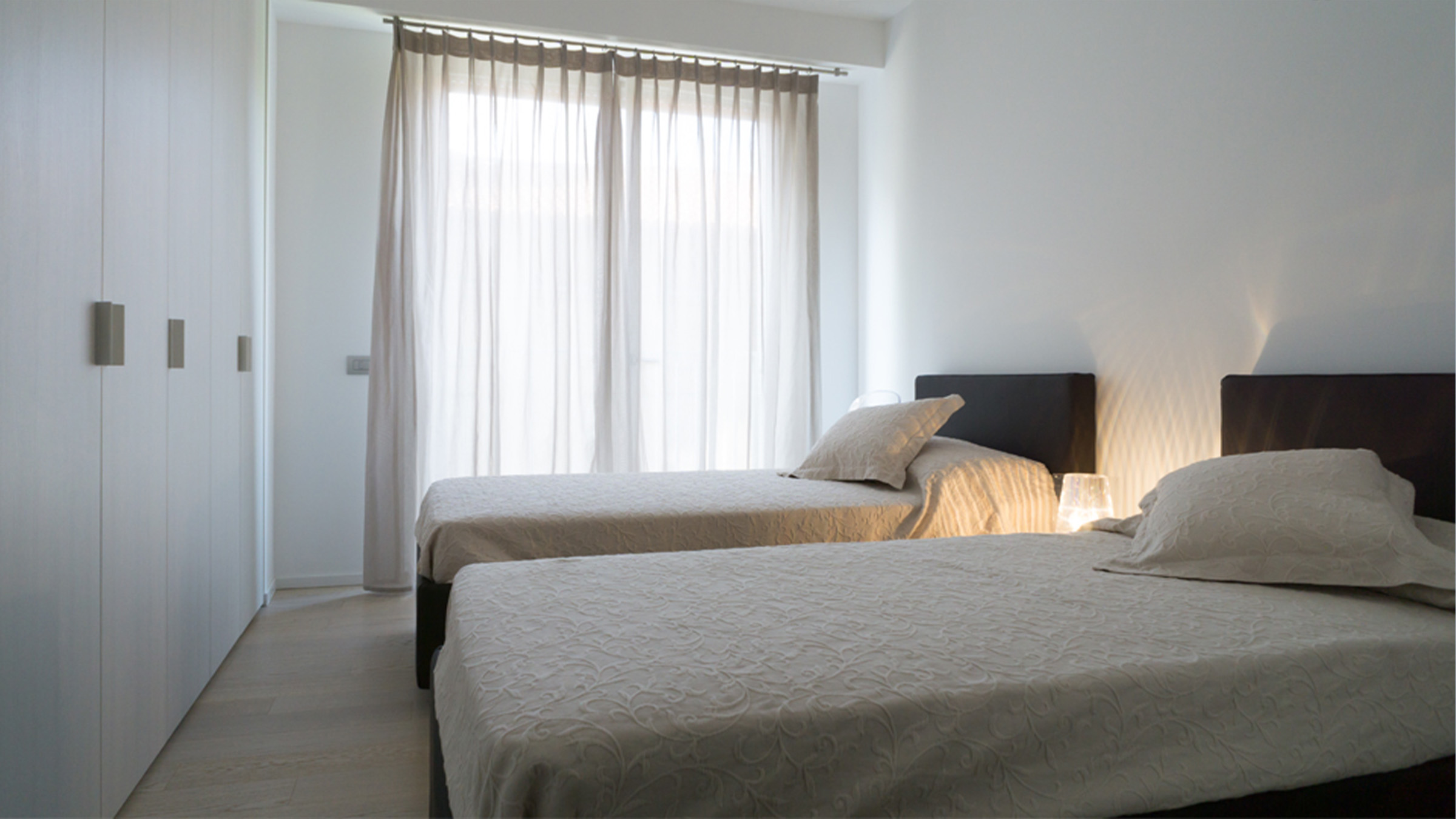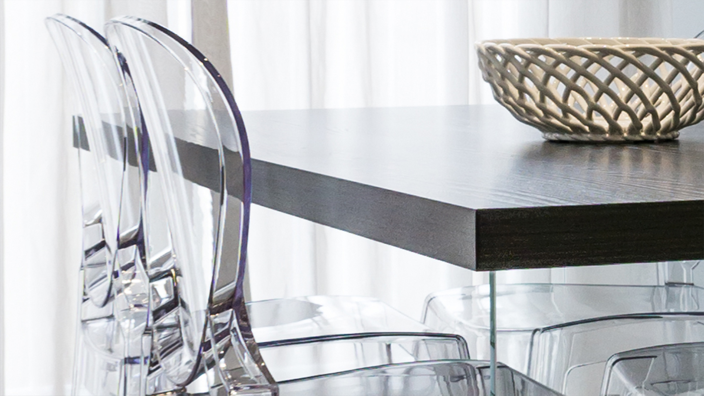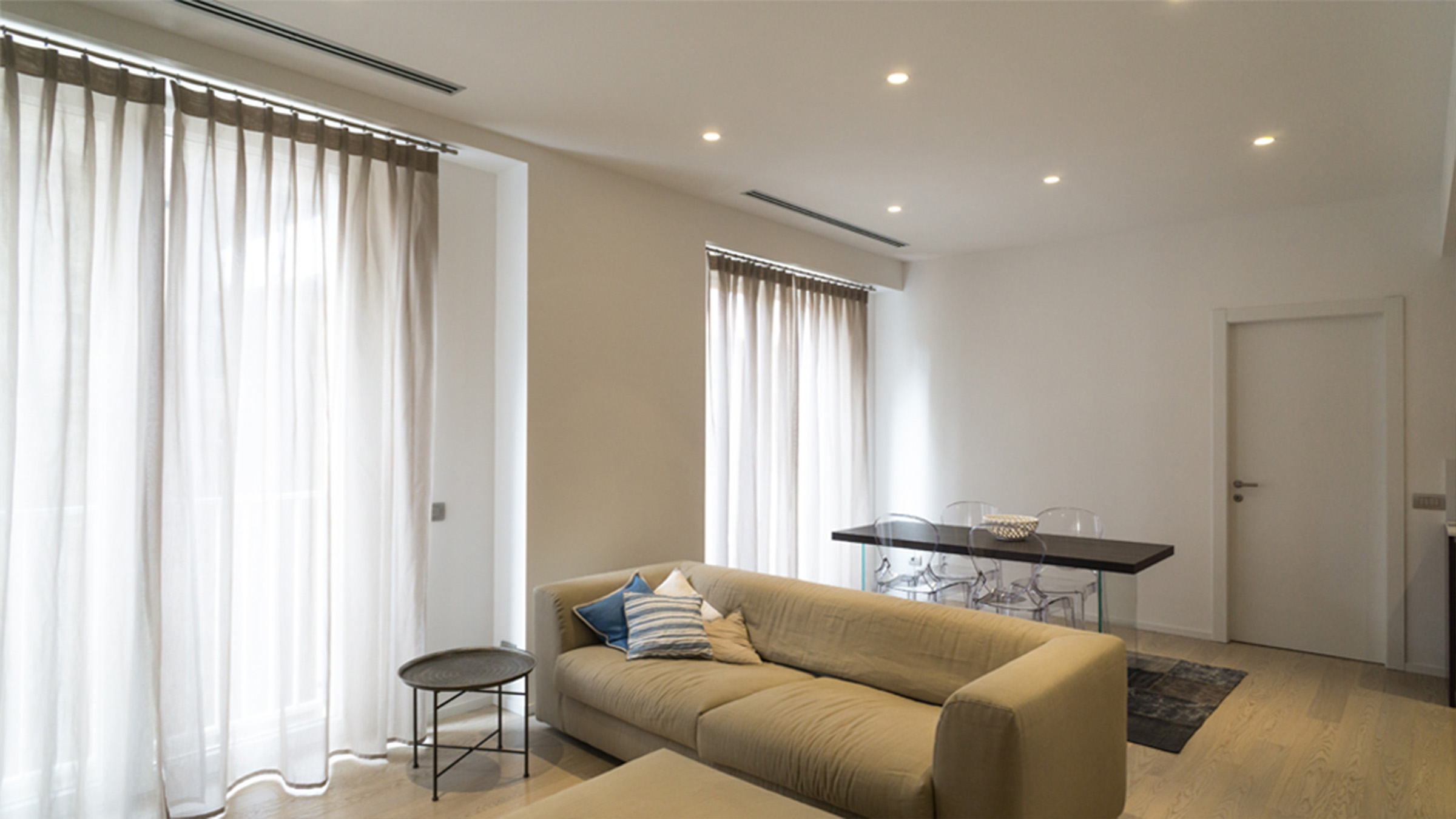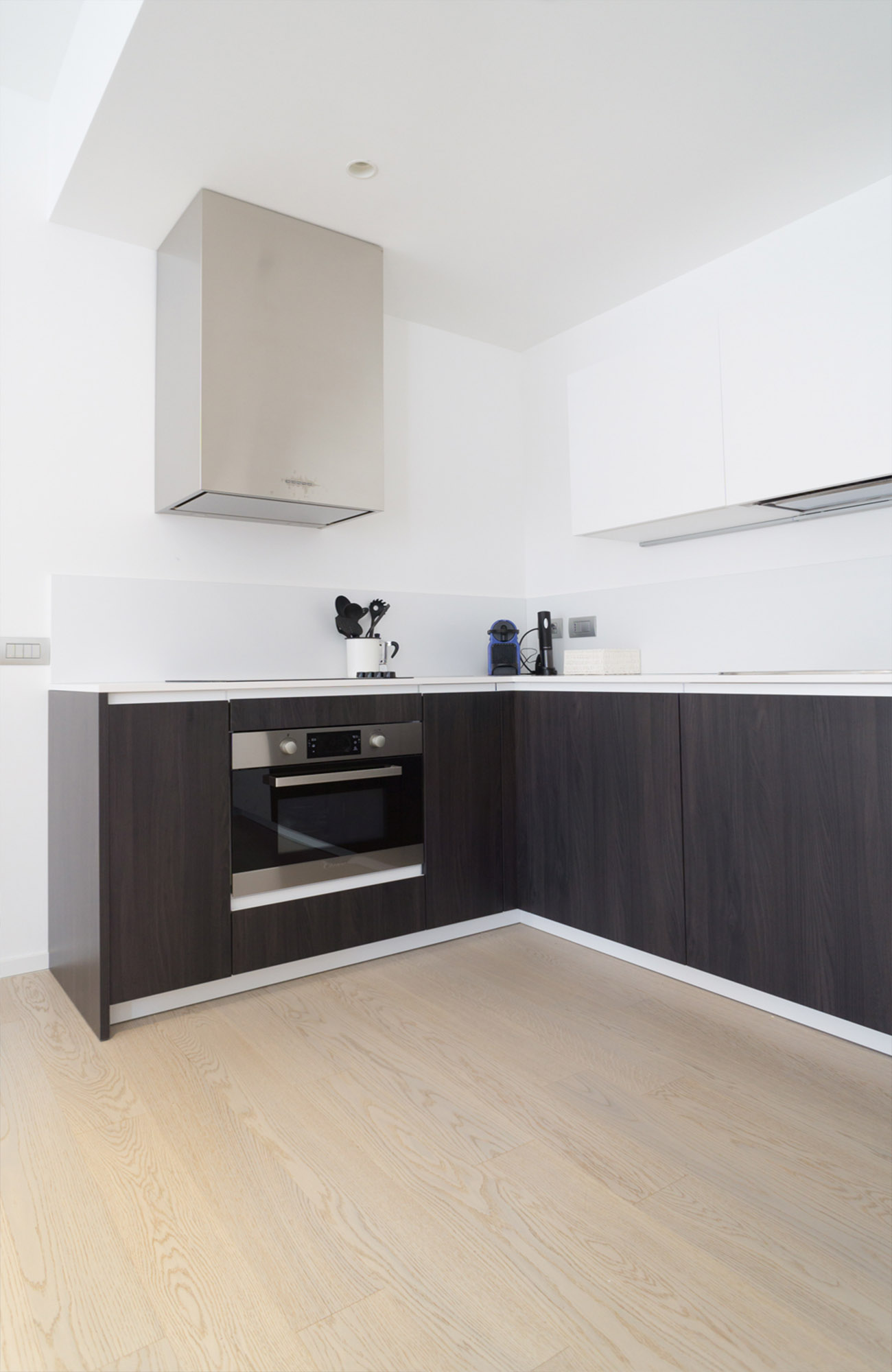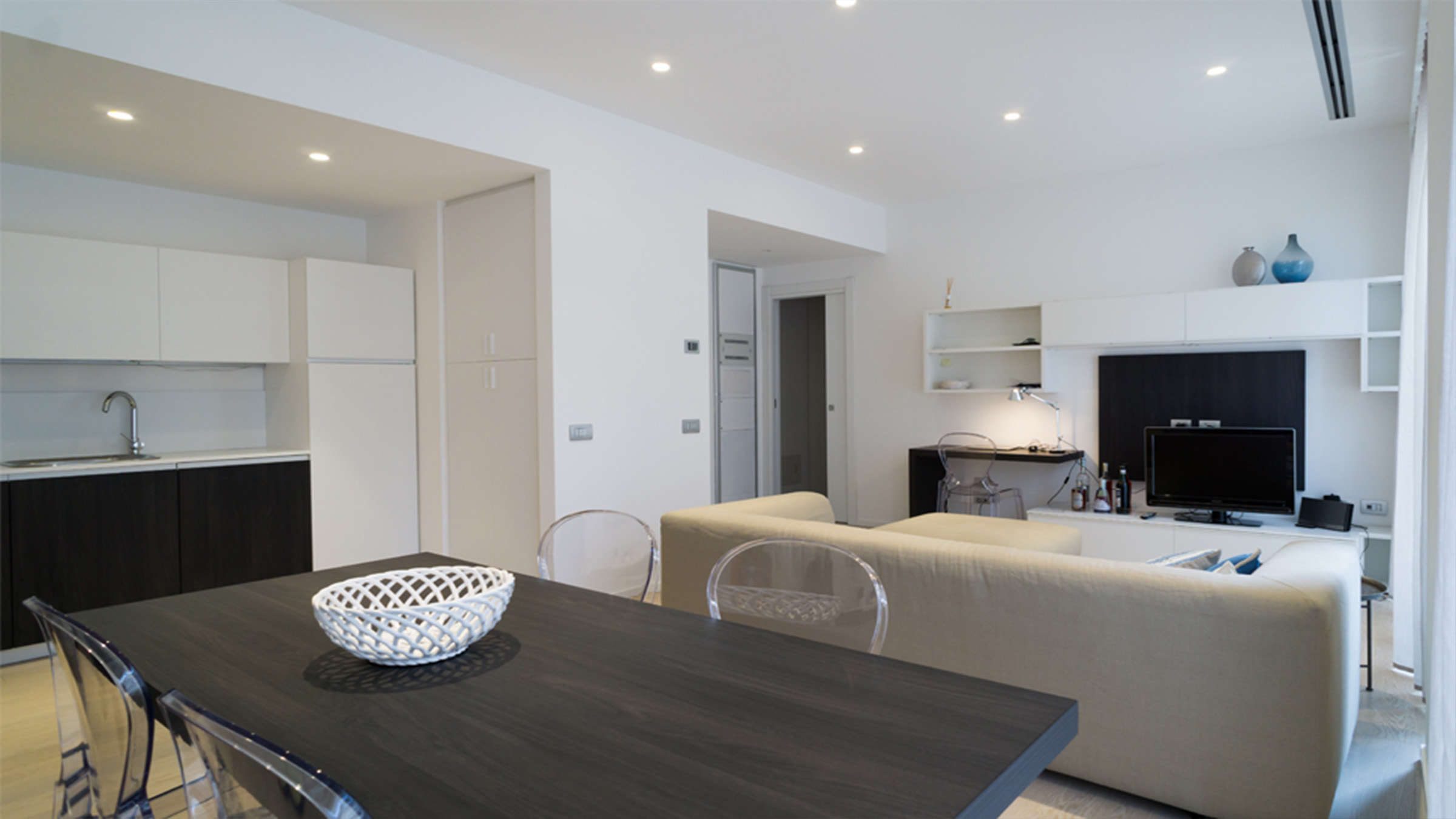 Living room with open kitchenette. The whitened oak parquet serves as a background for the contrasts created by the use of dark and white wood furniture. Glass, used for some of the furnishings, contributes to lighten the space.