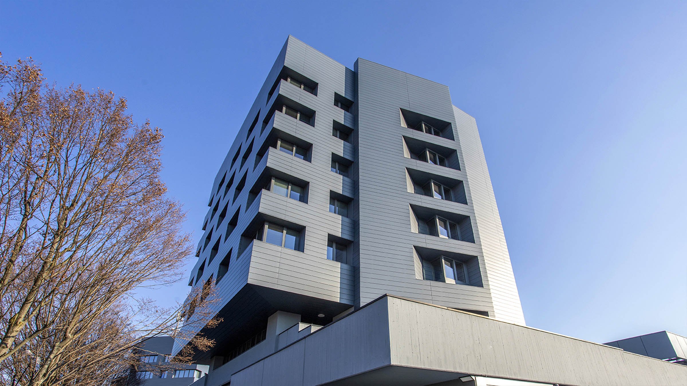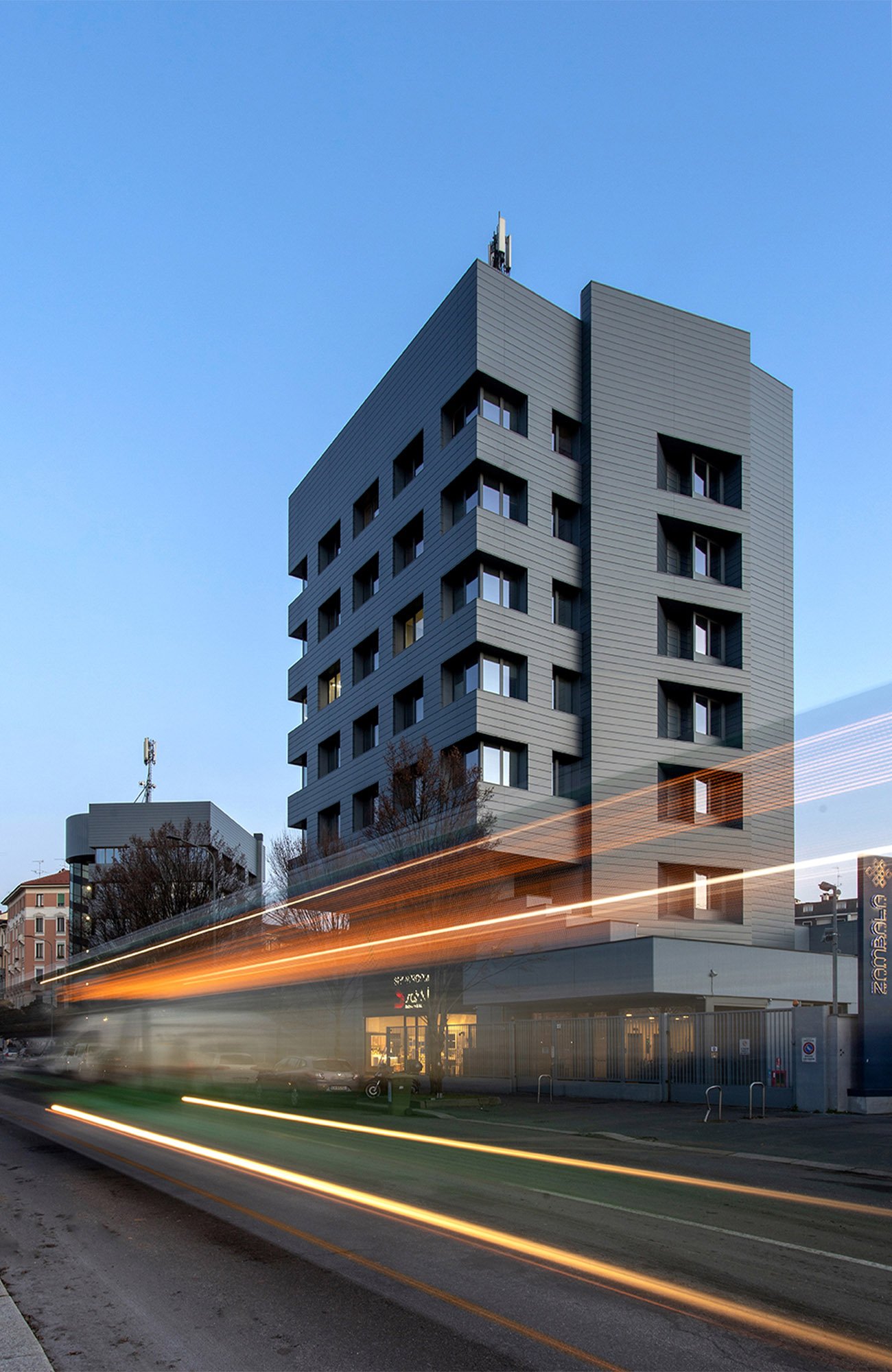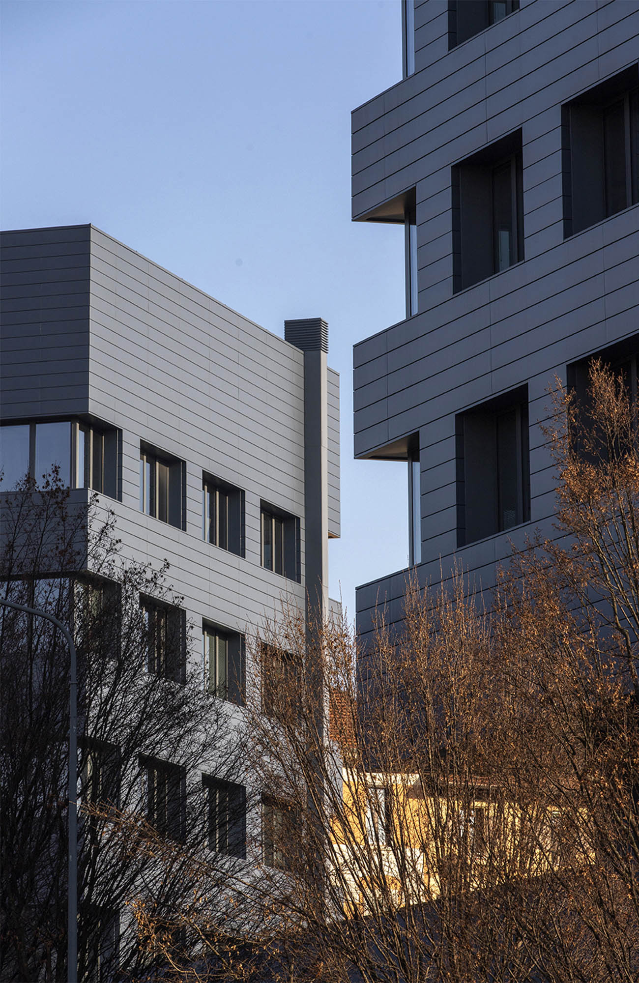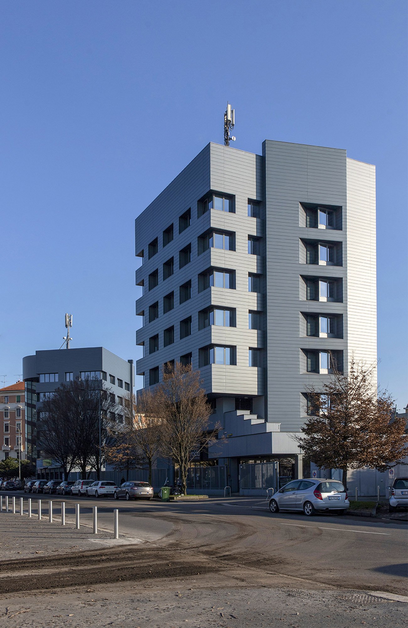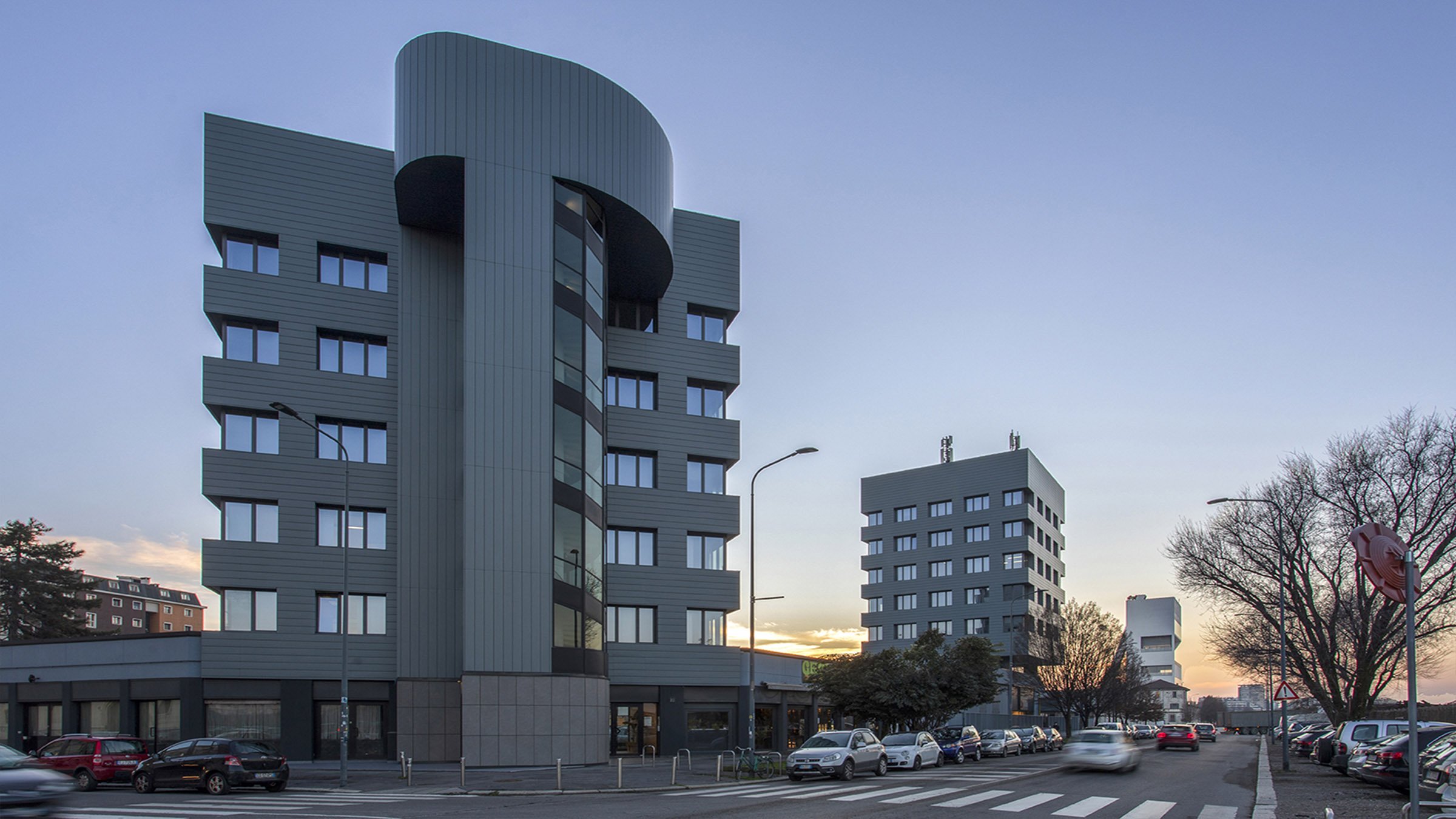 Riqualificazione di due torri a destinazione terziaria. Questi edifici, basati sull’efficientamento energetico, sono fortemente riconoscibili grazie ai materiali (VMZINC - www.vmzinc.com) utilizzati per le facciate.